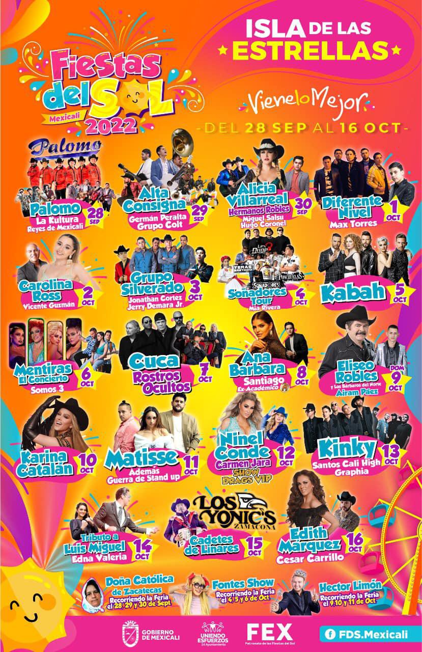 La edición 46 de las Fiestas del Sol en Mexicali, Baja California se lleva a cabo este 2022 del 28 de septiembre al 16 de octubre. Una gran feria con destacados espectáculos y atracciones que reúne anualmente a miles de visitantes de toda la región norte del país.