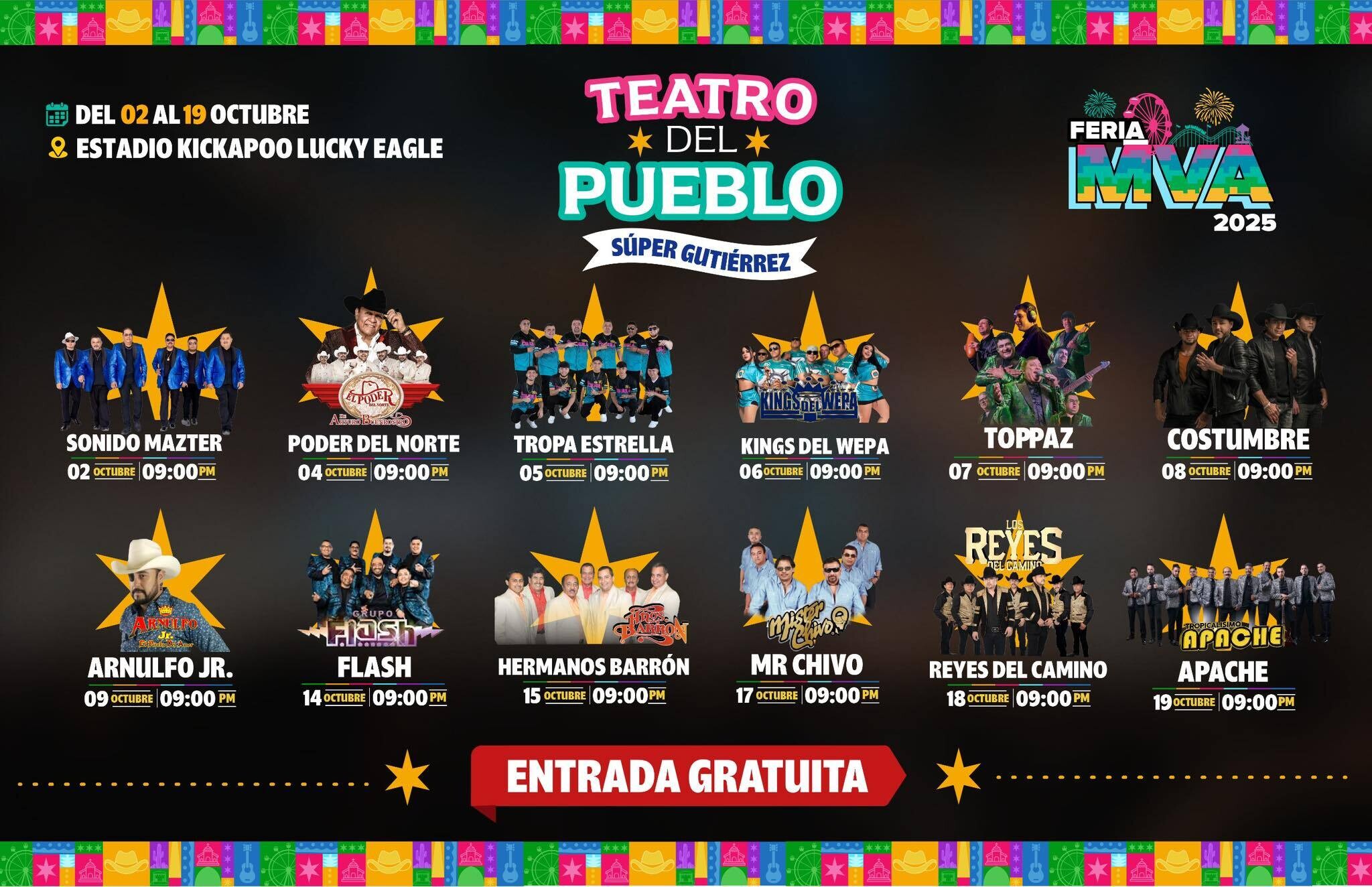 Sábado 11 de octubre | Presentación de Juntos (Artistas por confirmar) Estadio Kikapoo Lucky Eagle |